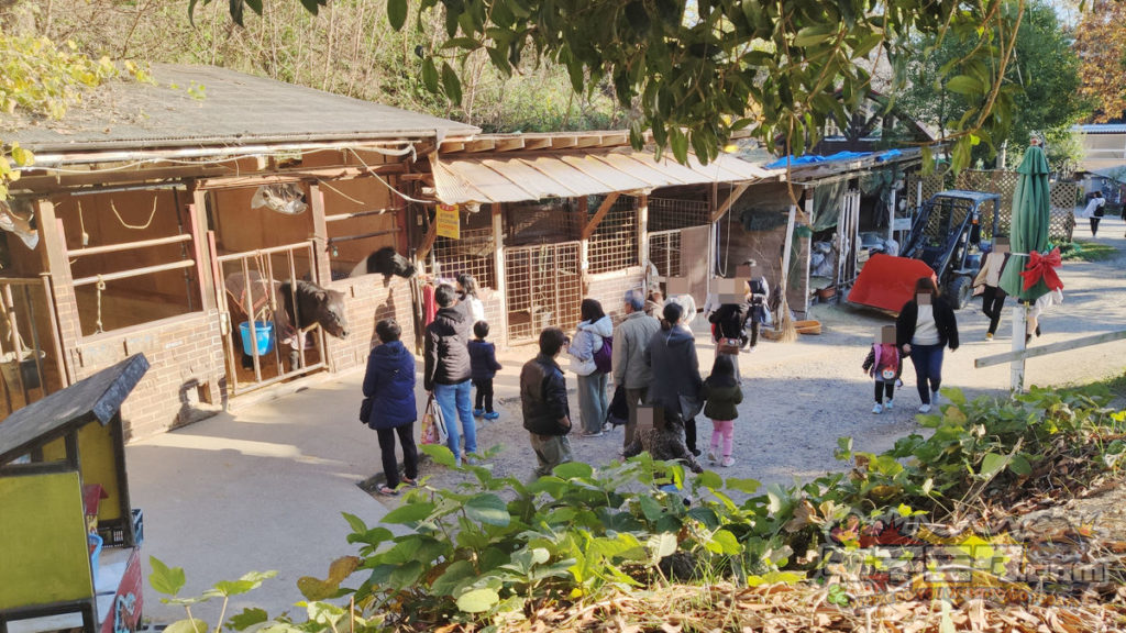 そのままの流れで、上の地図にはないポニー厩舎に向かいます。、場所的には引き馬乗り場の道を挟んで向かい側です。