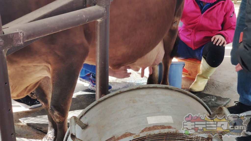 遠目から乳搾りを見ます、なんだか牛乳飲みたくなってきたぞ。