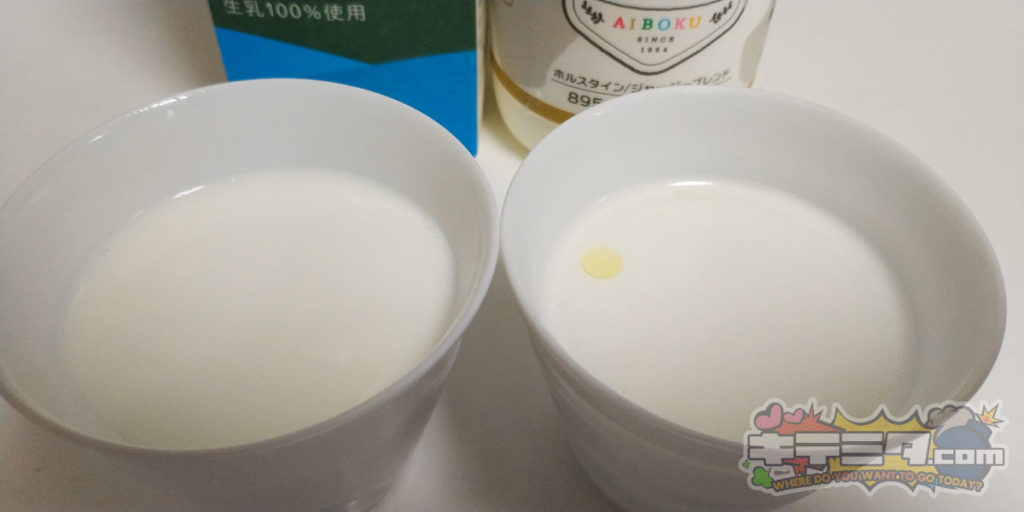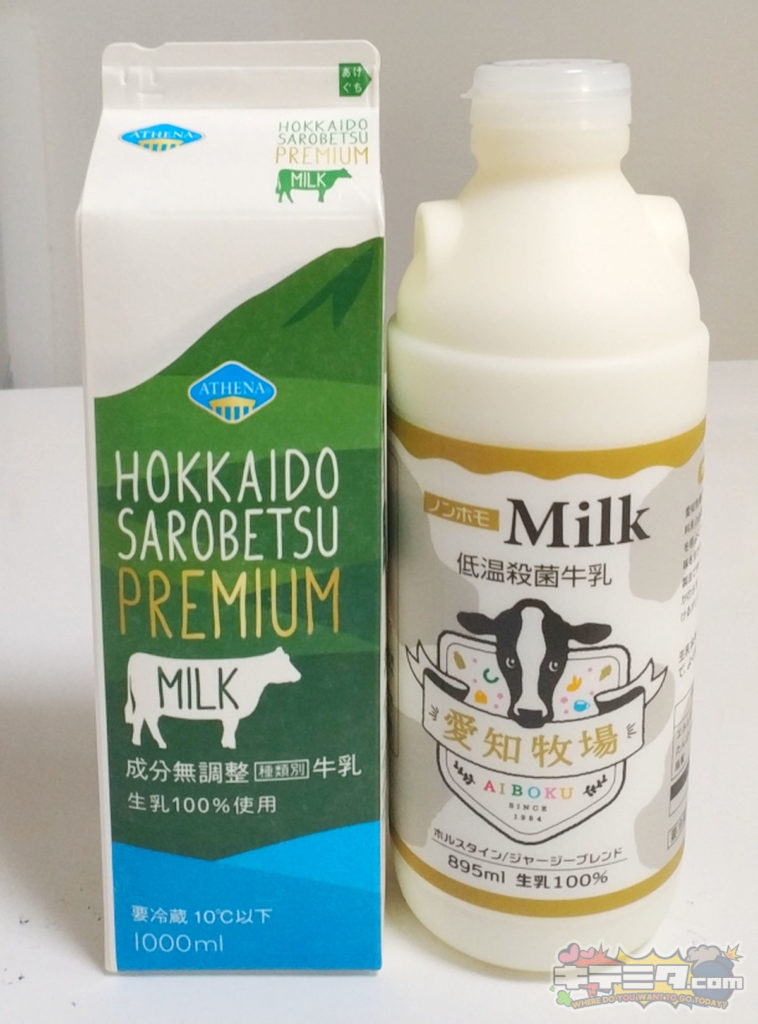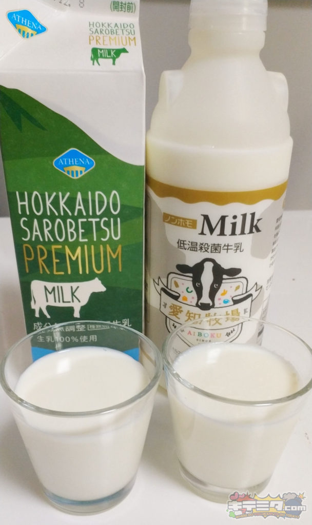 コストコサロベツ牛乳が純白に近く、愛知牧場ノンホモ牛乳はやや黄みがかっています!